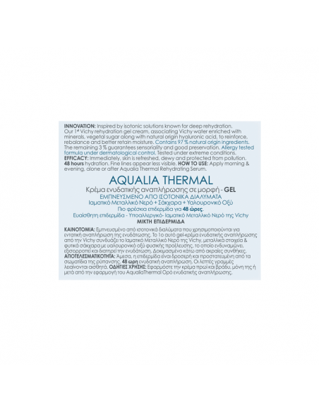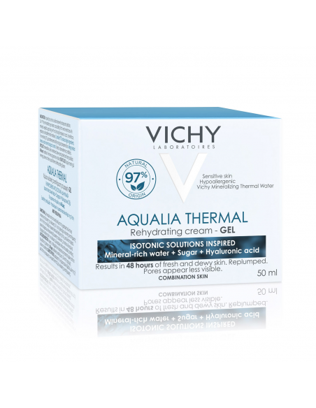 Vichy Aqualia Thermal-Creme-Gel, 50 ml. Aqualia Thermal Rehydrating Skin Care Gel spendet trockener und dehydrierter Haut intensive Feuchtigkeit. Enthält 97% Inhaltsstoffe natürlichen Ursprungs, wie Hyaluronsäure, stärkendes Vichy Mineralizing Water und Mannose-Pflanzenzucker. Die Haut wird sofort erfrischt, fühlt sich angenehm an, bleibt bis zu 48 Stunden mit Feuchtigkeit versorgt und wird auch bei Klimaschwankungen, Stress oder Umweltverschmutzung gestärkt.