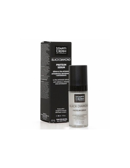 Martiderm Black Diamond Proteum Serum 30 ml. Thanks to its content of Proteum 89+, it reduces roughness and increases skin firmness, in addition to reducing and preventing skin ageing. Its antioxidant action makes the skin soft, hydrated, elastic and radiant, minimising expression lines and wrinkles.