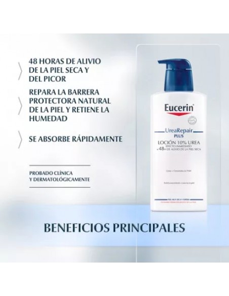 Eucerin Lotion UreaRepair Plus 10% Urea is suitable for people suffering from xerosis, keratosis pilaris (goose bumps), psoriasis or diabetes.