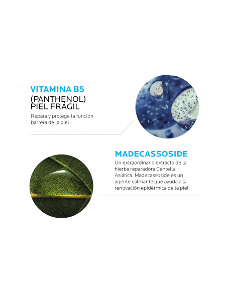 - Favorece la recuperación de la piel sensible tras irritaciones y alteraciones epidérmicas gracias a su fórmula que asocia Pantenol con Madecassoside.