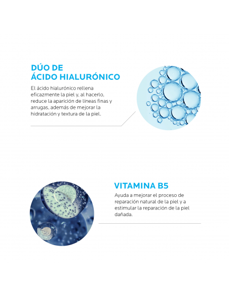 Está formulada a base de vitamina B5 y un dúo de ácidos hialurónicos, que convierten este tratamiento facial diario en un innovador cuidado antiaging. La vitamina B5 es reconocida por sus beneficios calmantes y reparadores en la piel. El ácido hialurónico de bajo peso molecular está fragmentado en moléculas de pequeño tamaño que pueden penetrar en las capas más profundas de la epidermis para una acción rellenadora.El ácido hialurónico de alto peso molecular actúa en la superficie de la piel hidratando la capa superior de la epidermis y creando una barrera que retiene el agua. Con agua termal La Roche-Posay, con propiedades calmantes. Su textura crema, fresca e hidratante, es ideal para todo tipo de pieles.