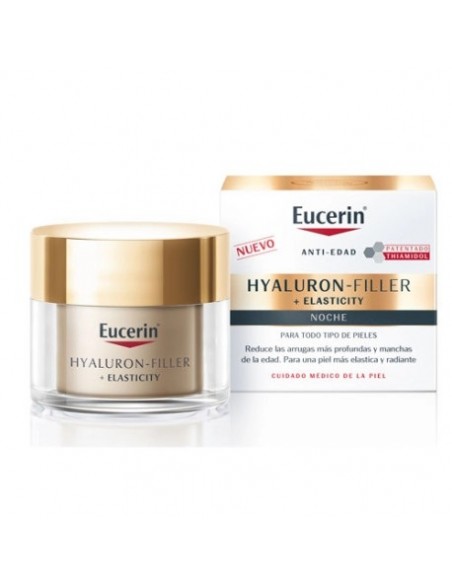 Eucerin Elsticity + Filler Crema De Noche 50 ml. Indicado para cuidado de las pieles maduras. Está formulada con aceites esenciales y enriquecida con ácido hialurónico. Devuelve la elasticidad y la firmeza gracias a la Arcitiina. Incrementa la producción de colágeno y protege la piel del estrés oxidativo. Es de rápida absorción. Piel más luminosa y fresca. Mejora la micro-circulación.