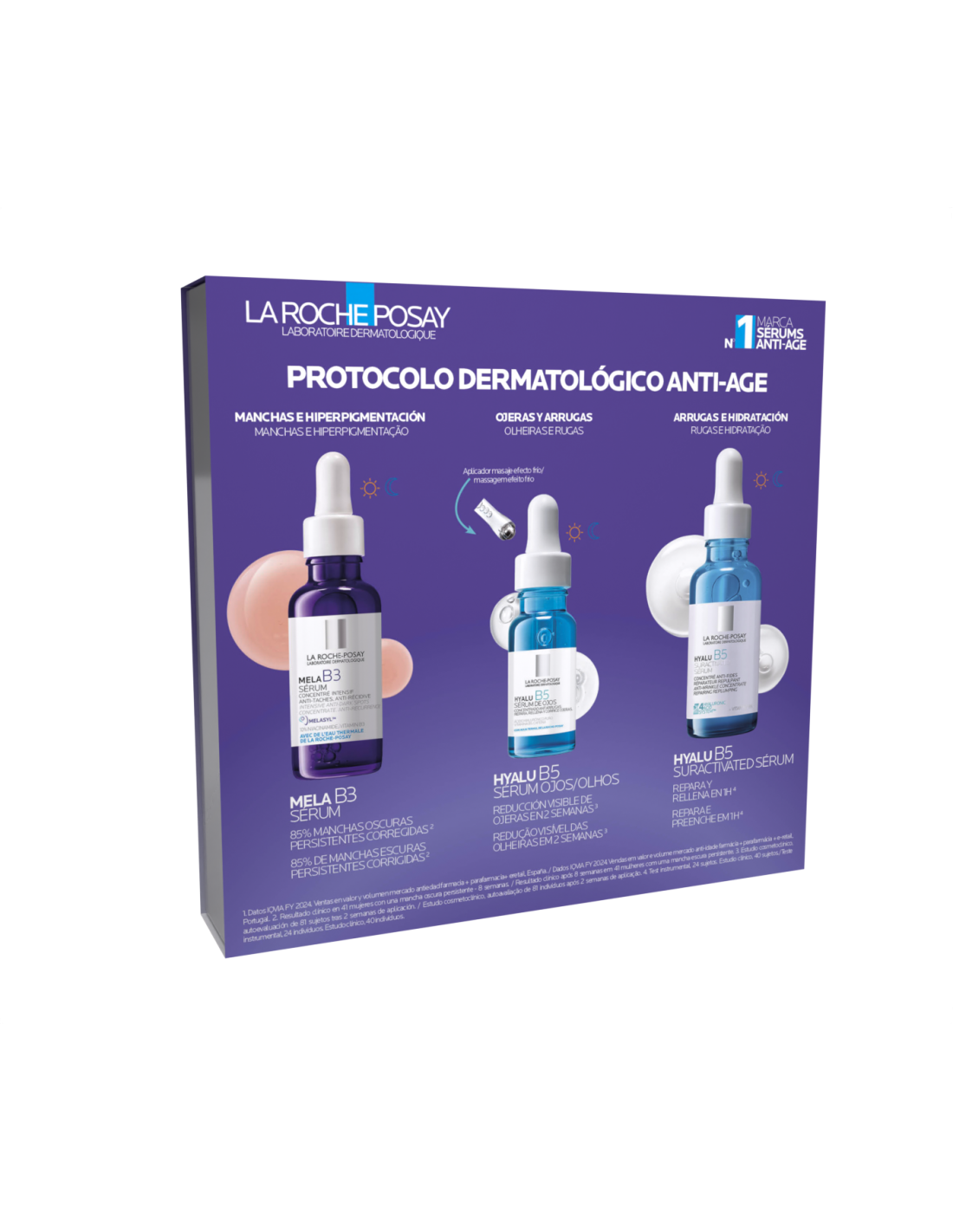 El pack La Roche Posay Mela B3 incluye un sérum antimanchas de 30 ml, acompañado por el Hyalu B5 Eye Serum de 5 ml y el Hyalu B5 Serum de 10 ml, para un tratamiento integral de la piel. El sérum Mela B3 reduce las manchas oscuras y unifica el tono de la piel, mientras que los sérums Hyalu B5 hidratan intensamente y combaten el envejecimiento.