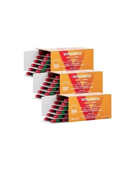 Vitacrecil Complex forte es un complemento alimenticio preparado a base de cistina, vitaminas y minerales para ayudar a mejorar el estado del cabello y las uñas.Fórmula reforzada que contiene L-cistina, ácido pantoténico, vitamina B6, biotina, hierro y zinc, con un mayor contenido en L-cistina y hierro. Favorece el vigor y el crecimiento de las uñas y el cabello. Se recomienda a personas con el pelo fino, débil, cuando la nutrición es desequilibrada, en situaciones de estrés, embarazo , lactancia, menopausia, para deportistas o en ocasiones donde se está consumiendo algún fármaco.No contiene azúcar ni gluten. Apto para diabéticos, celíacos e intolerantes a la lactosa.