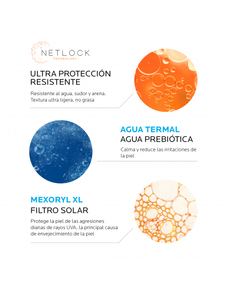 - La fórmula con tecnología Netlock combina una protección solar ultra alta y resistente en una fórmula más respetuosa con la vida marina.