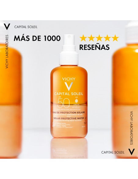 - Aplicar Vichy Capital Soleil Agua de Protección Solar Luminosidad SPF50 generosamente y extender por todo el cuerpo, 20 minutos antes de la exposición al sol.
