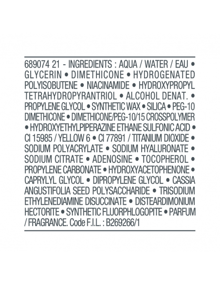 水、グリセリン、ジメチコン、水添ポリイソブテン、テトラヒドロピラン-3,6-ジオール、変性アルコール、プロピレングリコール、合成ワックス、ナイロン-12、ジメチコン、ジメチコン/PEG-10/15クロスポリマー HYDROXYETHYLPIPERAZINE ETHANE SULFONIC ACID, METHYLDIHYDROJASMONATE, SODIUM HYALURONATE, SODIUM POLYACRYLATE, ADENOSINE, DISODIUM EDTA, PROPYLENE CARBONATE, SYNTHETIC FLUORPHLOGOPITE, DISTEARDIMONIUM HECTORITE, PHENO XYETHANOL、CI 15985 / YELLOW 6、CI 77891 / TITANIUM DIOXIDE、PARFUM / FRAGRANCE。