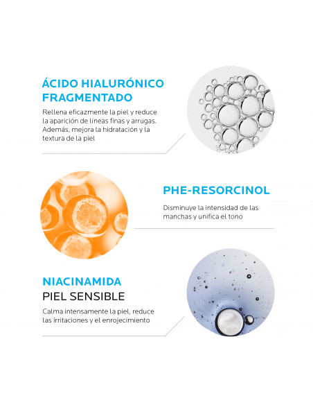 - Cellox-B3テックと、フラグメント化ヒアルロン酸、Phe-レゾルシノール、ナイアシンアミドなどの皮膚科学的補正分子を配合。