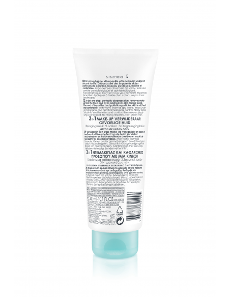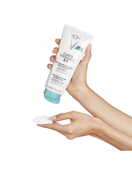 Vichy Pureté Thermale Desmaquilhante Integral 3 em 1 300 ml. É indicado para mulheres com pele sensível e é indicado para usuárias de lentes de contato.