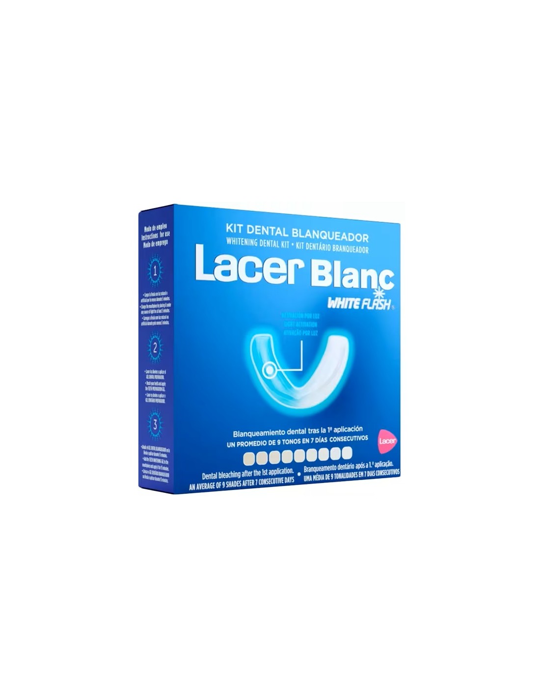 Kit de branqueamento dental, ativado por luz, confortável, fácil de usar e com efeito imediato após a primeira aplicação.