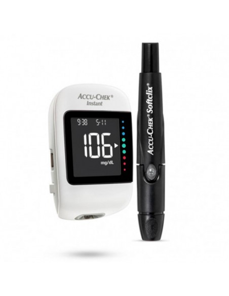Medidor de glicose instantâneo + dispositivo de punção Accu-Chek é um dispositivo de monitoramento de glicose no sangue mais simples e inteligente que fornece resultados precisos em menos de 4 segundos. Graças ao seu indicador de gama de cores, oferece clareza instantânea. Além disso, é um botão pronto para usar, sem necessidade de configuração e sincronização automática.