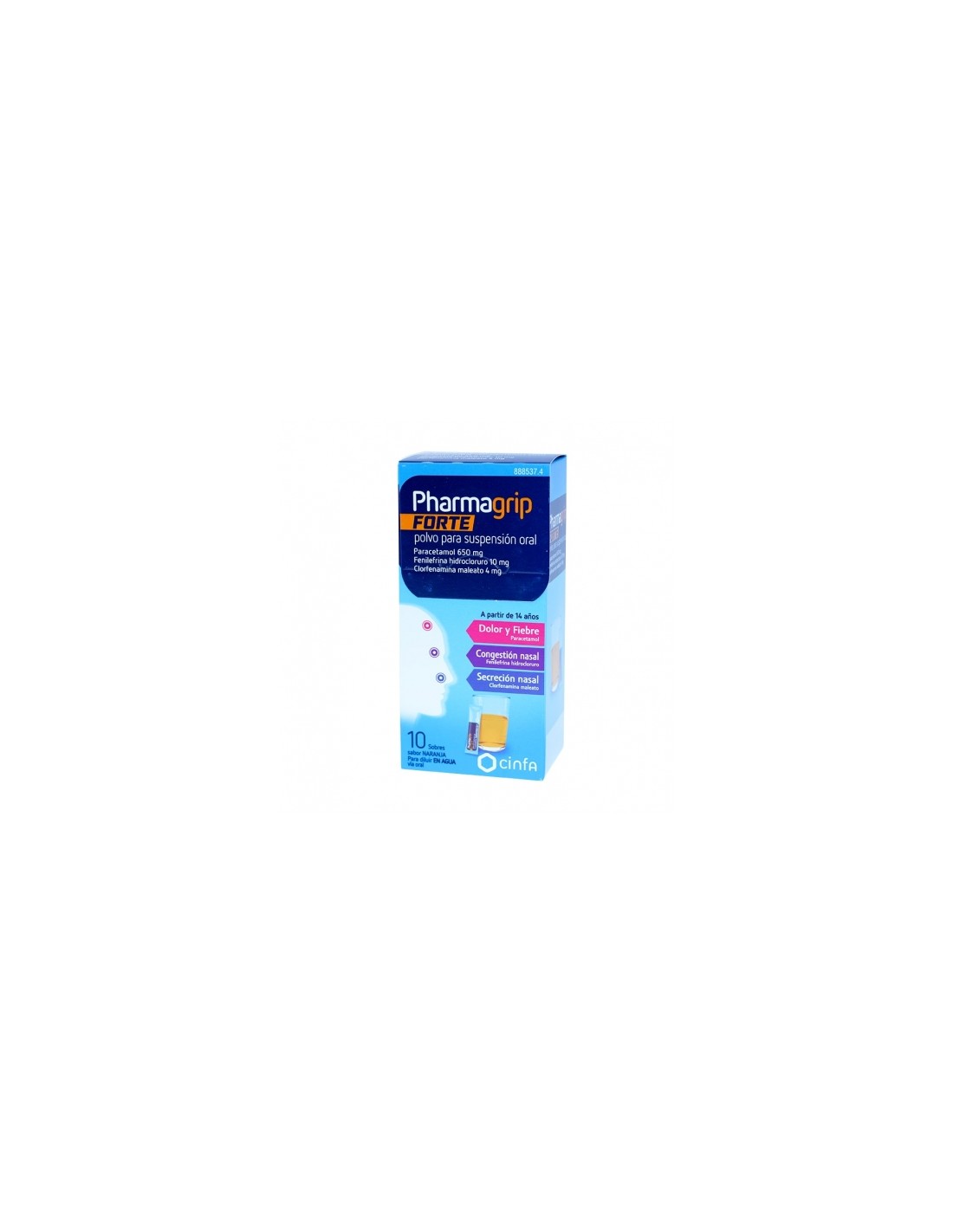 Pharmagrip forte pó para suspensão oral é apresentado em embalagens que contêm 10 saquetas.