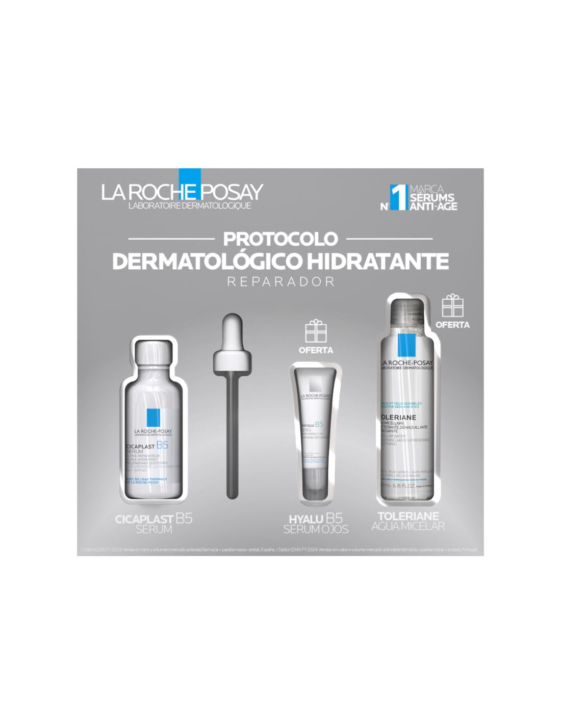 Este pack inclui o Sérum Ultra Reparador Cicaplast B5 da La Roche-Posay em formato de 30 ml, um tratamento intensivo em gotas para peles sensíveis que precisam de regeneração e reparação profunda. Além disso, inclui como oferta o Hyalu B5 Sérum Ojos de 5 ml, um concentrado específico para a zona delicada do contorno dos olhos, e Água Micelar 50 ml, um limpador suave que elimina impurezas e maquilhagem, respeitando a barreira cutânea. Ideal para adultos com pele sensível, irritada ou danificada, em formatos práticos para uso diário.