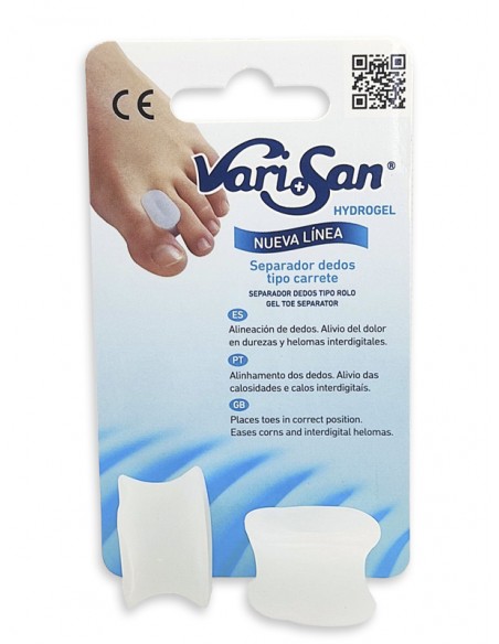 Varisan Hydrogel Separator Reel Tamanho P. Separador indicado para o alinhamento dos dedos e para o alívio da dor em dureza e helomas interdigitais. Produto inodoro e hipoalergénico.