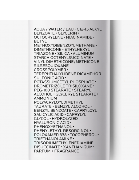 - Aqua / Water / Eau, C12-15 Alkyl Benzoate, Ci 77891 / Titanium Dioxide, Glycerin, Octocrylene, Propylene Glycol, Niacinamide, Butyl Methoxydibenzoylmethane, Dimethicone, Ethylhexyl Triazone, Octenilsuccinato de amido de alumínio, polímero cruzado de vinil dimeticona/meticona silsesquioxano, ácido tereftalilideno dicânforo sulfónico, fosfato de cetilo de potássio, trisiloxano de drometrizole, Estearato de Peg-100, Álcool Estearílico, Estearato de Glicerilo, Taurato de Amónio Poliacriloildimetil, Ácido Capriloil Salicílico, Caprililglicol, Ci 77491 / Óxidos de Ferro, Ci 77492 / Óxidos de Ferro, Ci 77499 / Óxidos de Ferro, Edta dissódico, Ácido hialurónico hidrolisado, Fenoxietanol, Resorcinol de feniletilo, Poloxâmero 338, Acrilato de poli C10-30 alquilo, Tocoferol, Trietanolamina, Goma xantana, Parfum / Fragrância. (Código F.I.L C262252/1).